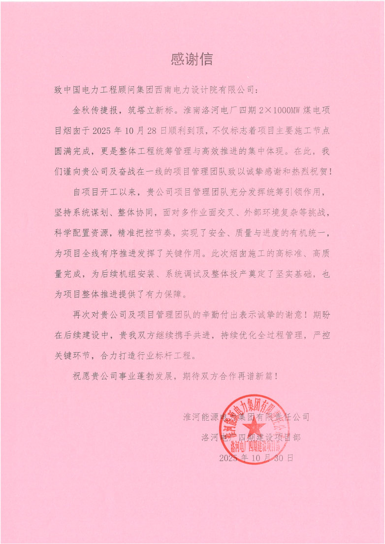 淮河能源電力集團(tuán)有限責(zé)任公司洛河電廠四期建設(shè)項(xiàng)目部發(fā)來的感謝信